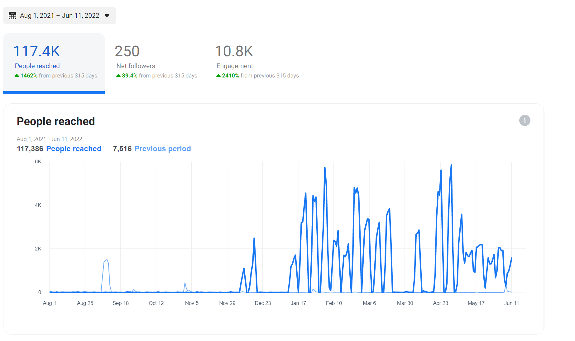 Overall analytics over time to present-day since I started. We have 10.8k in engagement in posts and accumulated 250 new followers, the number continues to grow!